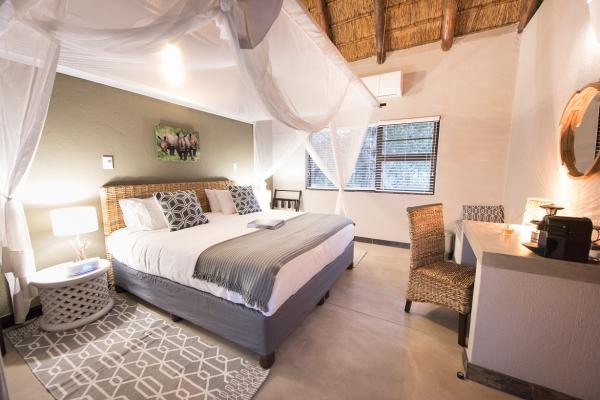 Alle kamers hebben een topkwaliteit kingsize extra length bed, Egyptisch katoen bedlinnen, een muskietennet, fan en airco. De grote en comfortabele badkamer is van alle gemakken voorzien en heeft een buitendouche waar je ’s avonds onder de Afrikaanse sterrenhemel kunt douchen: het summum van luxe. Iedere kamer heeft een eigen veranda met zitje. De kamers liggen aan de prachtige tuin met grote bomen en hebben uitzicht op de rivierbedding waar dieren als giraffen, zebra´s, kudu´s, stekelvarkens en wrattenzwijnen graag rondlopen.