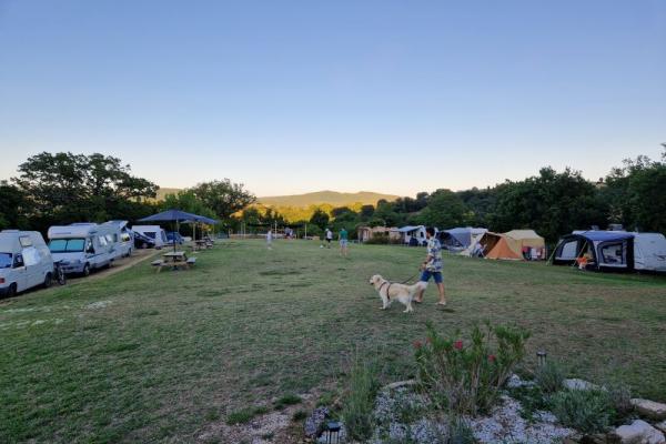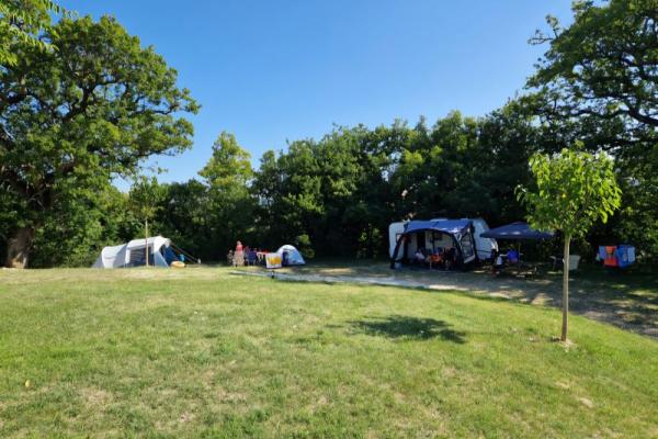 De 14 ruime kampeerplaatsen, variërend van 120 tot 250 m², zijn voorzien van water, 10A stroom, een picknicktafel en een parasol of schaduwdoek.